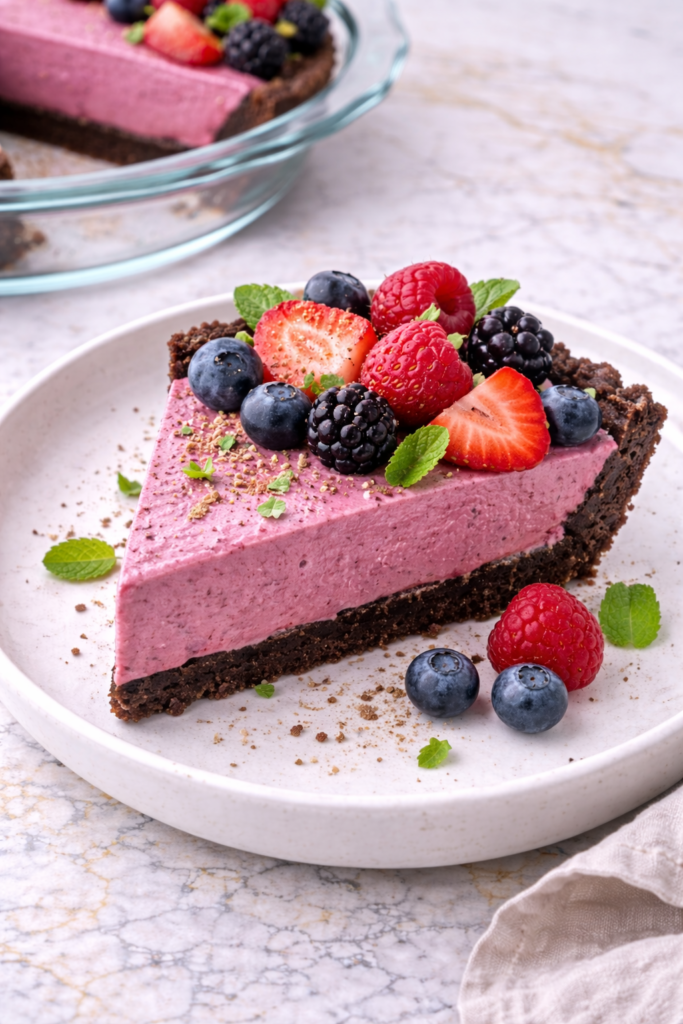 Avocado blends into the creamiest filling without any dairy, and the berries on top add that bright, slightly tart contrast that keeps every bite from feeling too rich. It sets up beautifully in the fridge and looks stunning when you bring it to the table.
