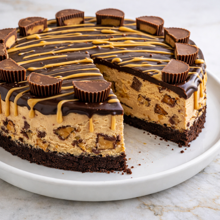 Indulge in this decadent Reese's Peanut Butter Cheesecake recipe that combines creamy filling with chocolate crust and candy surprises throughout.