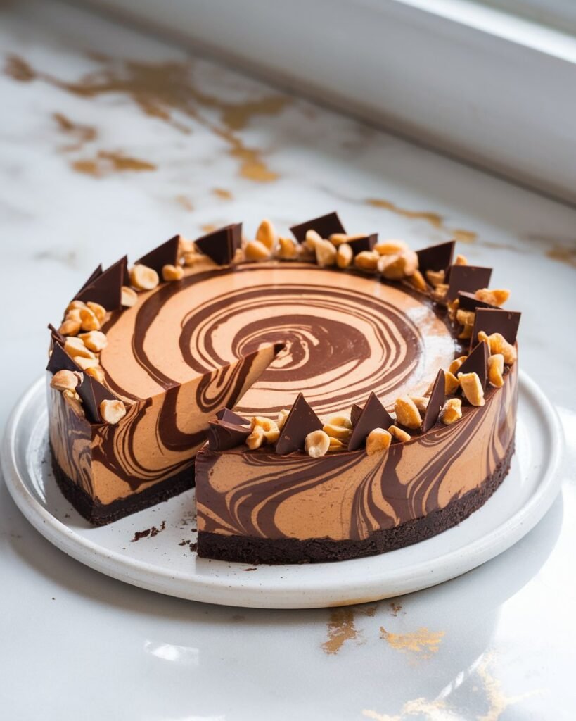 The magic of this Chocolate Peanut Butter Swirl Tart lies in its beautiful contrast—silky chocolate ganache against creamy peanut butter, swirled into a pattern as unique as your signature.