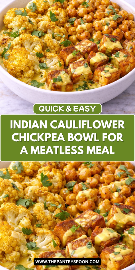 This Indian cauliflower chickpea tofu bowl is all about bold flavor and satisfying texture. The roasted cauliflower develops a slightly crispy edge, while the chickpeas and tofu absorb the spices, creating a rich and well-balanced dish. Every bite feels hearty and flavorful.