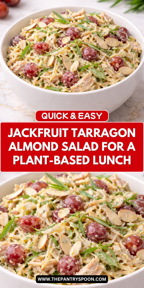 It surprised me completely — shredded jackfruit has a tender, meaty texture that holds the creamy dressing really well and takes on the tarragon in a way that feels fresh and a little elegant. Almonds bring in a gentle crunch that makes every bite more satisfying.